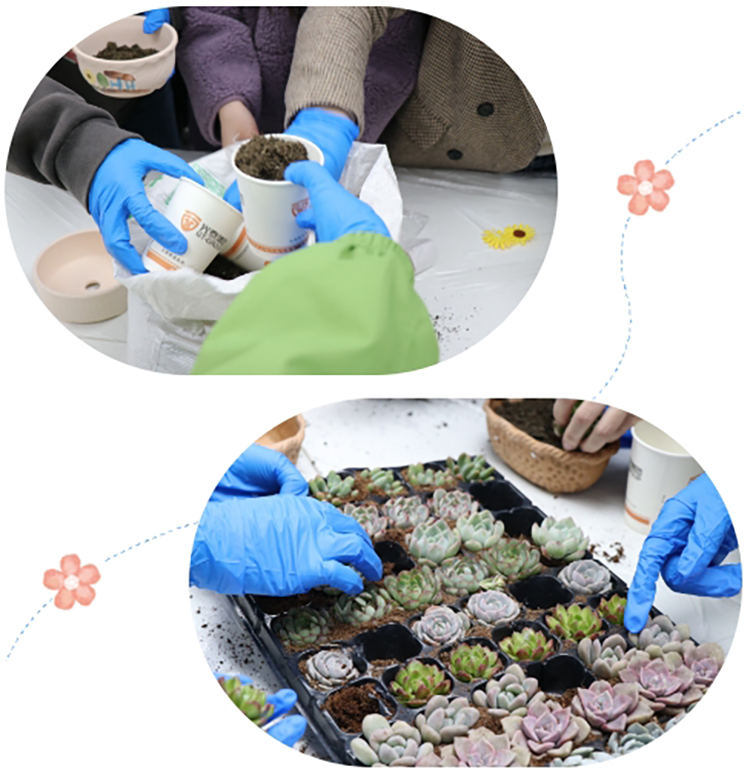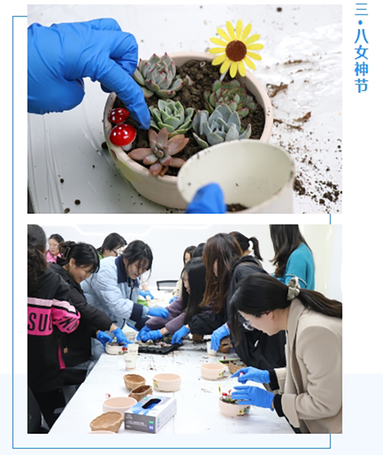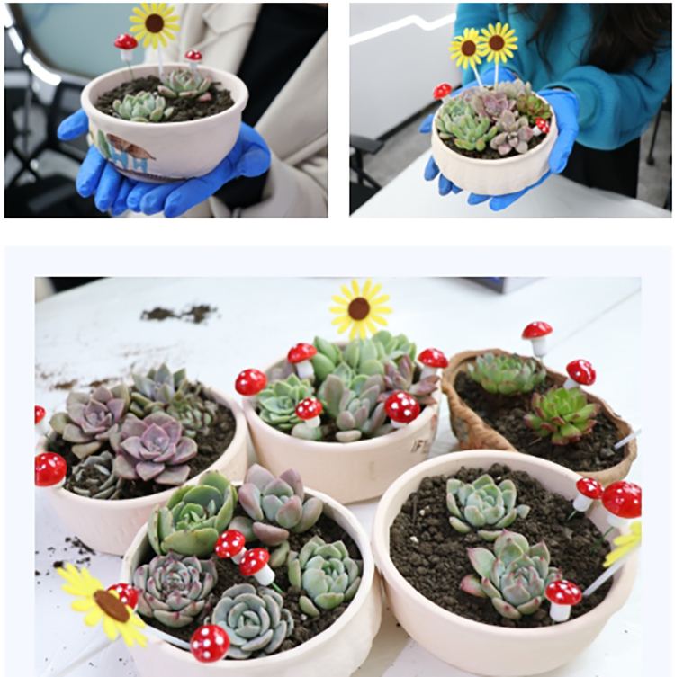 活動現場布置了多種多肉植物、彩繪花盆及裝飾材料,專業園藝師為女職工們詳細講解多肉植物的生長習性、搭配技巧及養護知識。從選盆配色到植物組合,從造景到擺件裝飾,女職工們充分發揮創意,將萌趣多肉與微型景觀巧妙結合,打造出各具特色的生態小世界。“這個圓圓的花盆特別符合我的審美!”研發部楊女士捧著親手制作的多肉盆栽愛不釋手說“搭配上小蘑菇和仿真向日葵,仿佛把春天捧在了手心。”