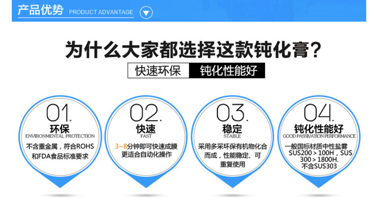 2.適用于不銹鋼SUS200系列SUS300系列鈍化后提供中性鹽霧測試時間不銹,鈍化性能穩定,也可以輕微的去除表面的焊斑、氧化皮、銹跡