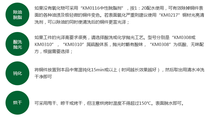 本品外觀茶色透亮、富有清新的草本氣味,具有無毒、使用壽命長的特點。使用本品能夠在銅件表面快速形成一層致密的化學鈍化膜,可有效抵御O2、H2S等腐蝕性氣體及粉塵對銅件的氧化。適合各類銅件、銅管及鍍銅和化學仿銅的抗氧化處理。與同類產品KM0407相比,本產品使用成本較低,但耐蝕性略遜。