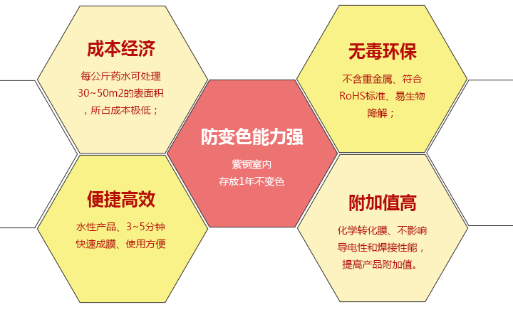本產品是快速鈍化成膜配方,能夠在3~5分鐘之內快速的在銅件表面形成抗氧化性良好的鈍化膜,保持紫銅件室內存放1年以上不變色。本品屬水基產品,因此非常適合各類銅材在加工轉序中或處理后的防氧化處理。本品采用環保的雜環類有機物合成,無毒無腐、不含鉻酸及亞硝酸等有害物質、具有生物降解性能,完全符合環保要求。